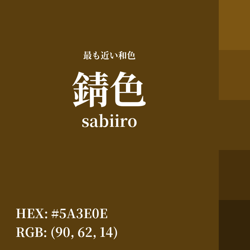 #5A3E0E : 最も近い和色「錆色 (sabiiro)」 茶系 (Brown) Twitter Facebook はてブ Pocket LINE コピー 2025.12.20 HEX #5A3E0E RGB (90, 62, 14) 類似和色 錆色 (sabiiro) – 類似率 93% この色の心理効果 食欲を増進させる効果 自信と勇気を与える リーダーシップを発揮させる 2025/12/20