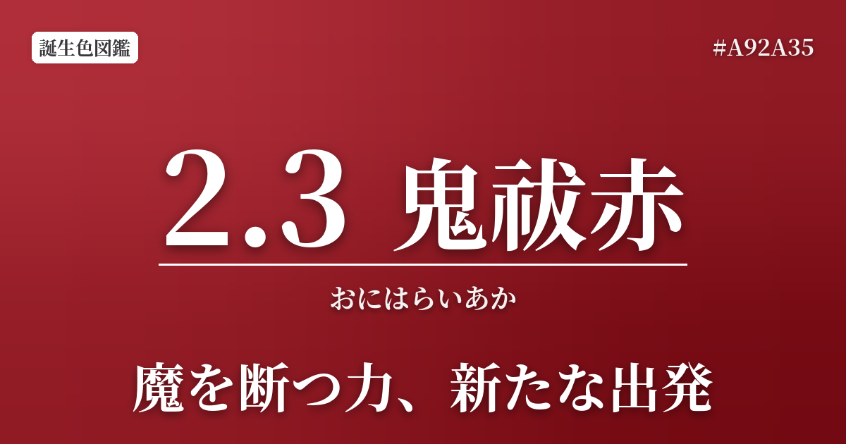 2月3日の誕生色は「鬼祓赤(おにはらいあか)」です。その名の通り、節分の豆まきで邪気を祓う力強さと決意を象徴するような、深みのある赤色です。燃え盛る炎のような情熱と、魔を寄せ付けない神聖な雰囲気をあわせ持っています。