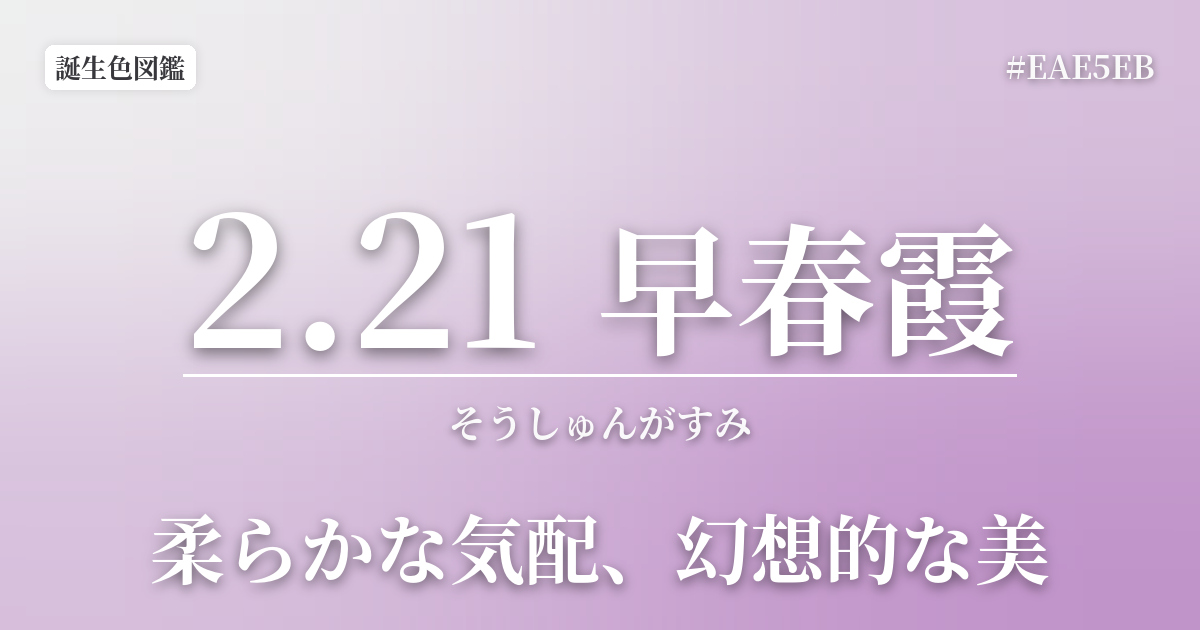 「早春霞(そうしゅんがすみ)」は、春の訪れを告げる霞のように、ほんのりと紫がかった淡い灰色のことです。まだ寒さの残る早春の朝、遠くの山々や景色を柔らかく包み込み、輪郭をぼかす幻想的な風景を思わせます。
