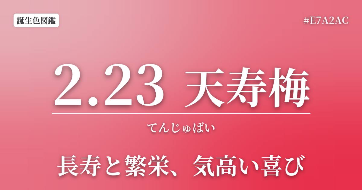 2月23日の誕生色は「天寿梅(てんじゅばい)」です。この誕生色は、当サイトが季節や行事から着想を得て独自に創作したもので、長寿と繁栄への願いが込められています。